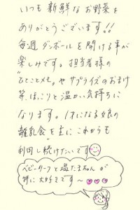 いつも新鮮な野菜をありがとうございます。 おいしく食べさせて頂いております。