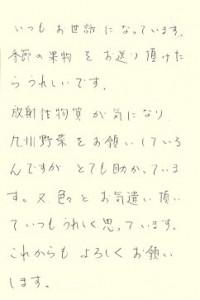 いつもお世話になっています。 季節の果物をお送り頂けたらうれしいです。 放射性物質が気になり九州野菜をお願いしているんですが、とても助かっています。 又、色々とお気遣い頂いていつもうれしく思っています。 これからもよろしくお願いします。