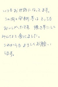 いつもお世話になってます。 この間の安納芋はとってもおいしかったです。 焼き芋にしてみんなで食べました。 これからもよろしくお願いします。